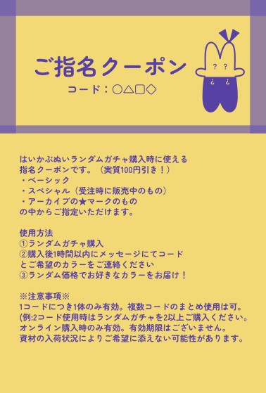 ランダムガチャ価格で指定カラーぬいを購入できるクーポンコードです。(実質100円引き)