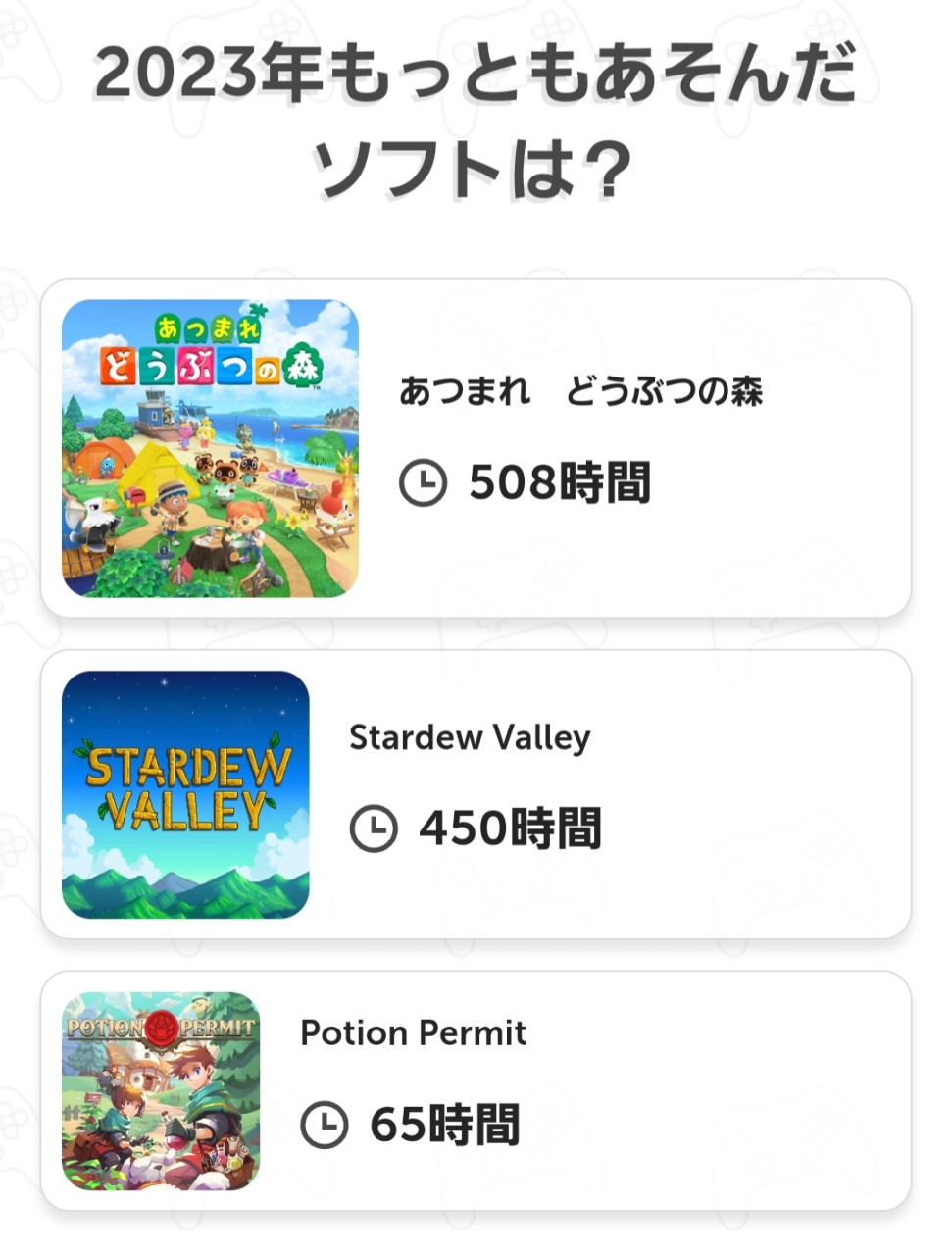 それでも今年一番長く遊んでたソフトはあつまれどうぶつの森らしい。
