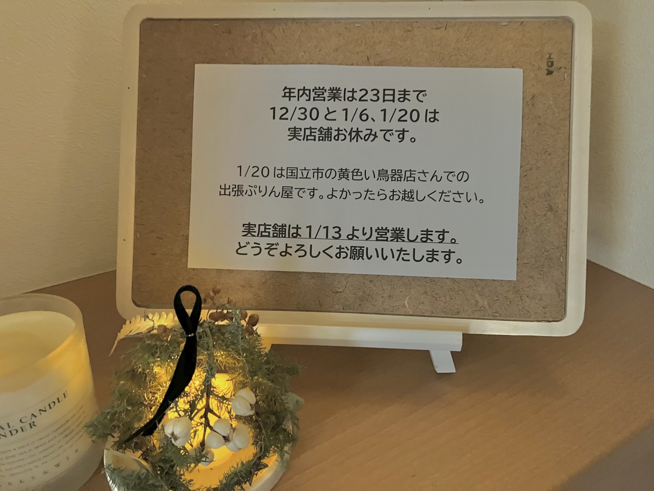 年明けの営業は1月13日より。毎年恒例の黄色い鳥器店さんでの出張ぷりん屋は20日になりましたので、20日は実店舗お休みです。