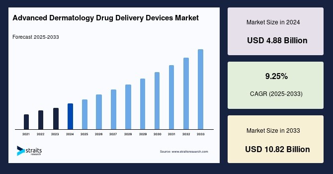 Straits Research によると、世界の先進皮膚科薬剤送達デバイス市場の規模は、2024 年に 4,882.33 億米ドルと評価されました。予測期間 (2025 ~ 2033 年) 中に 9.25% の CAGR で成長し、2033 年には 10,824.8 億米ドルに達すると予想されています。