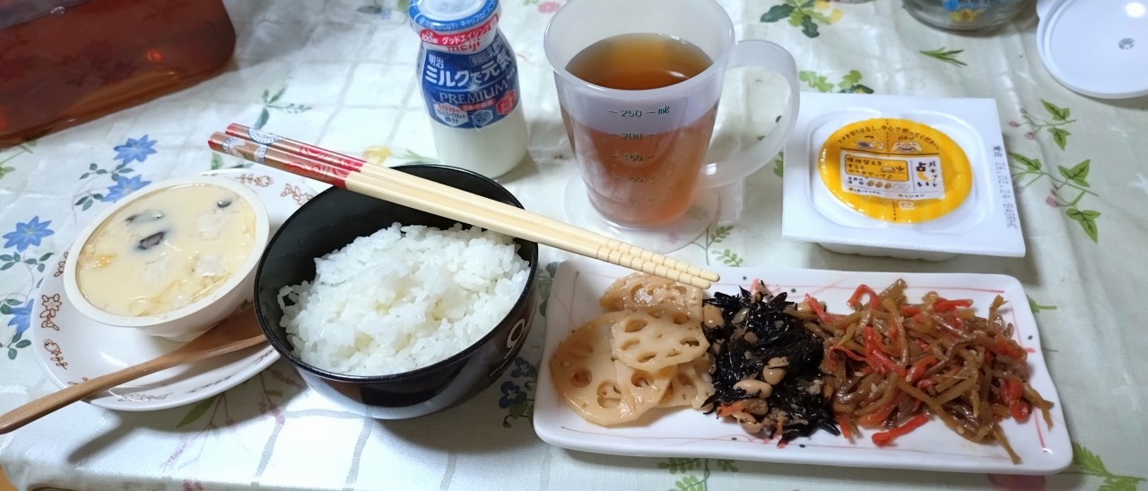 今朝は、7:30に起きました。 今朝の朝ごはんは、ご飯150㌘に納豆と玉子焼き3つ、ウインナー1本、冷食2個、小さい野菜惣菜2個…