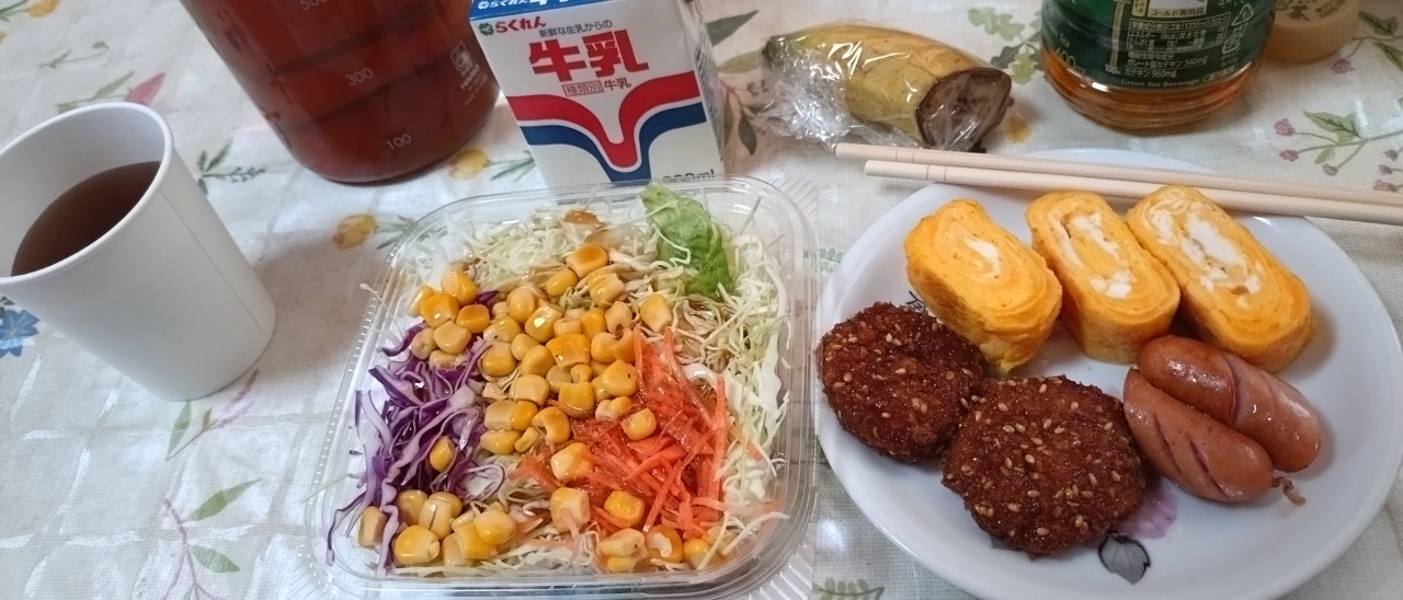サラダ🥗玉子焼き3つ、ウインナー1本、冷食2個、バナナ🍌二分の一、牛乳🥛200ml、麦茶。