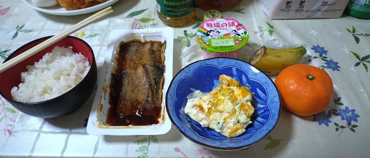 ご飯150㌘、イワシの蒲焼き、カボチャサラダ🥗、ヨーグルトイチゴ🍓味小さいのを1個、バナナ🍌二分の一、🍊みかん1個食べました。