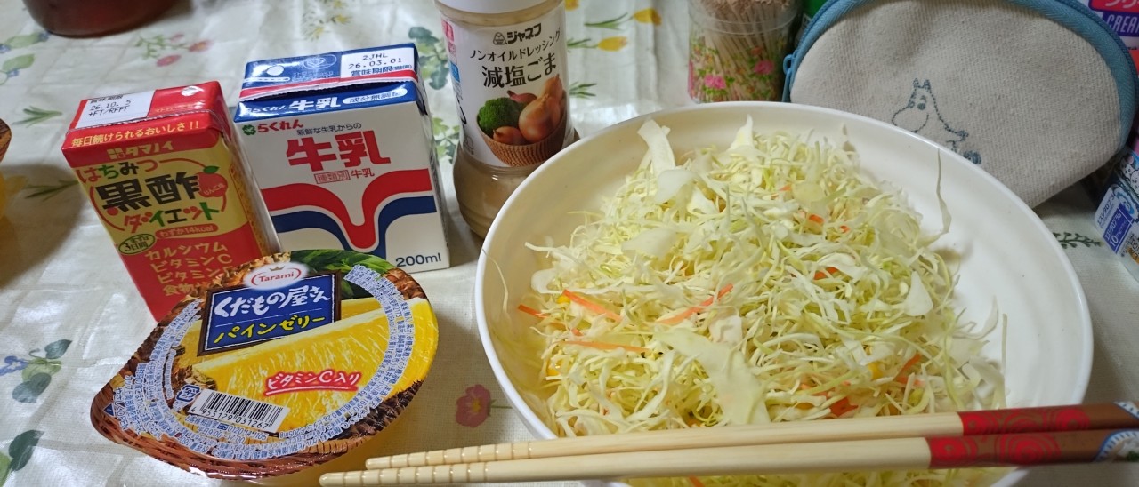サラダ🥗、パイナップル🍍ゼリー、黒酢、牛乳🥛、麦茶。