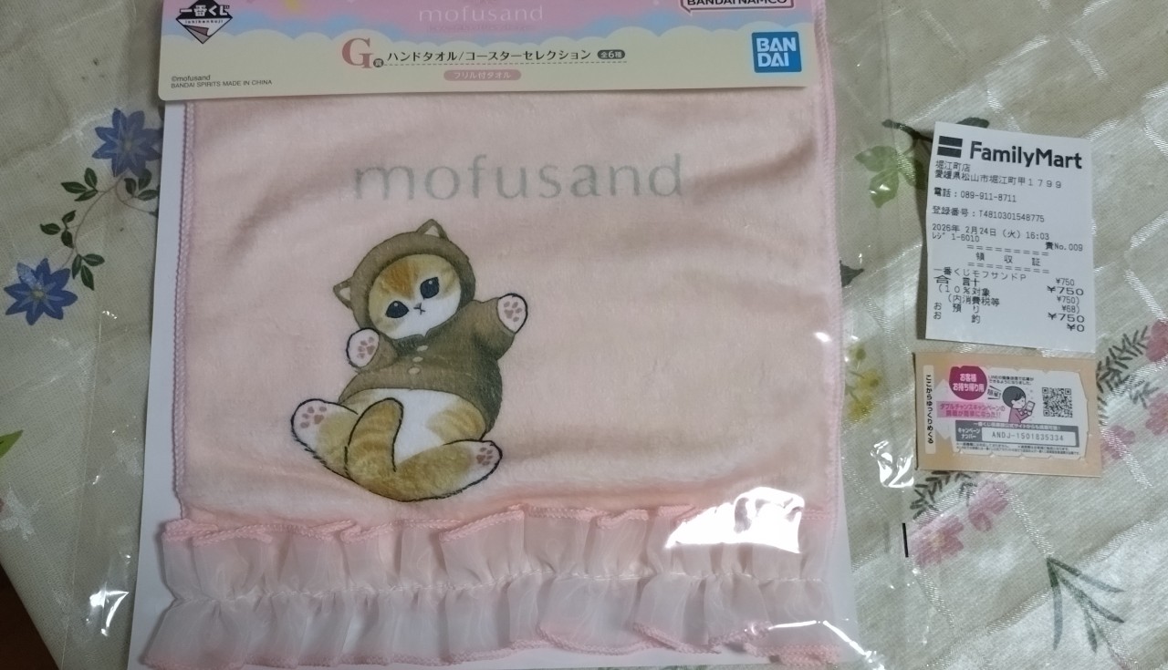 ファミマで、くじを1回だけ引きました! ネコさんのハンドタオルが当たりました! 嬉しかったです。