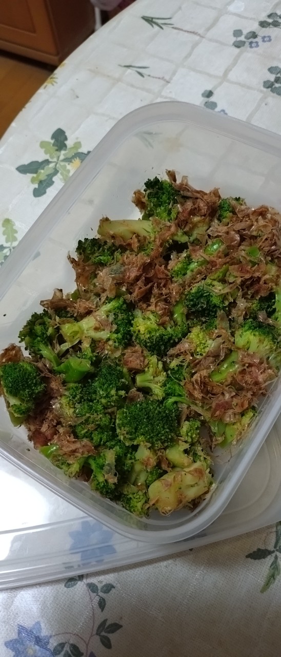 レンジで冷凍ブロッコリー🥦を解凍して、水気をキッチンペーパーで取り、かつお節を混ぜて、減塩醤油を少し回し入れて、よく混ぜて完成です😊。