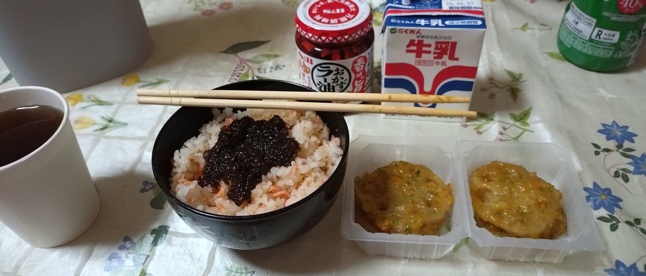 ご飯。冷食惣菜2個。玉子焼き3つ。 ウインナー1本。麦茶。 でした! 写真撮り忘れました。