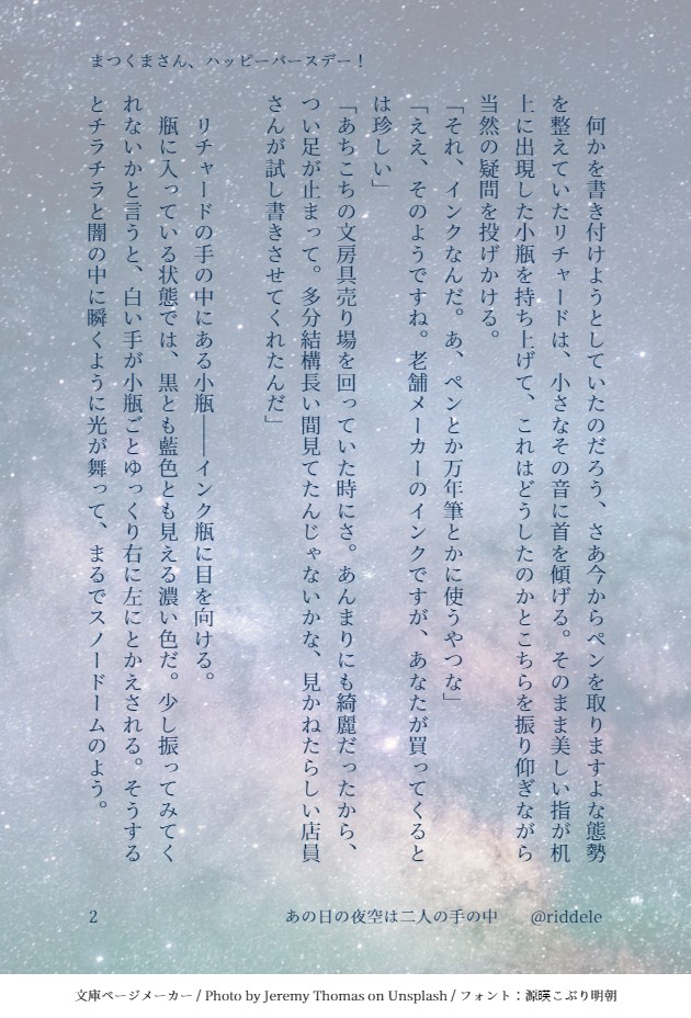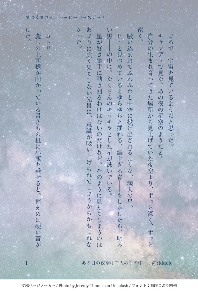 まつくま様(Twitter:@sudachibluepp/Taittsuu:@matsukuma)のお誕生日に合わせて書かせて頂いたお話です。