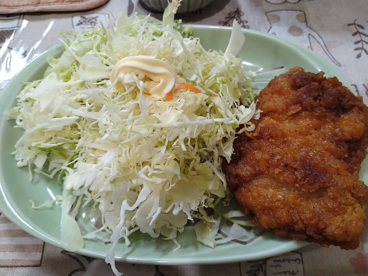 キャベツを千切りし、ロピチキをチン♪ 汁物は午前中から煮込んだ豚汁。