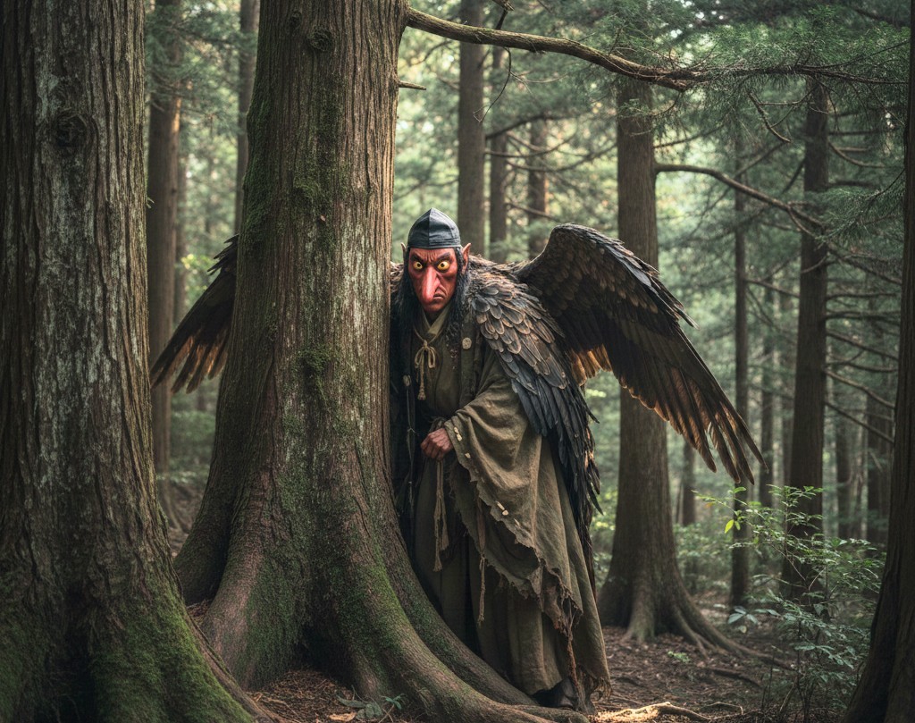 そして彼女の後ろには、木陰に隠れる烏天狗がいた。「そっちも何してんの?」と声をかけたが、無言で目を逸らされた。シャイな天狗っているのだろうか。まぁ、そんなものが見えたりする私は変な人なのだが、Geminiの画像生成能力の高さに惚れ惚れした。