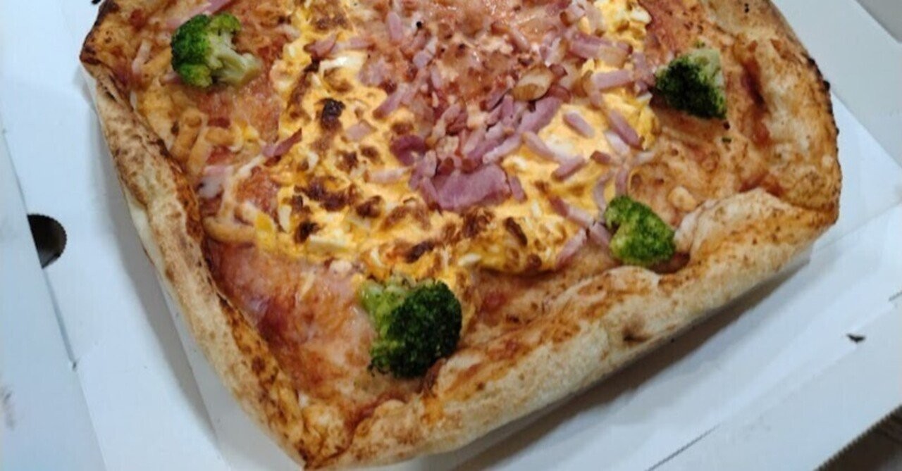 初めて食べる味。なかなか旨かった。本当は丸いピザだが、そもそも箱が小さいからニ辺が直線になる。もしくは、たまたま生地が膨らみ過ぎたかだな。