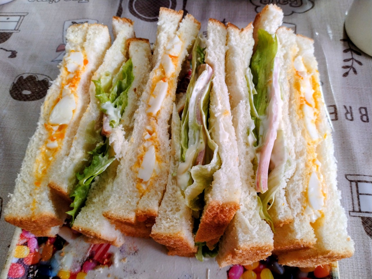 引き続き今日もサンドイッチ。違いはパンを三枚にし、卵と胡瓜ツナのダブルサンドにしたこと。