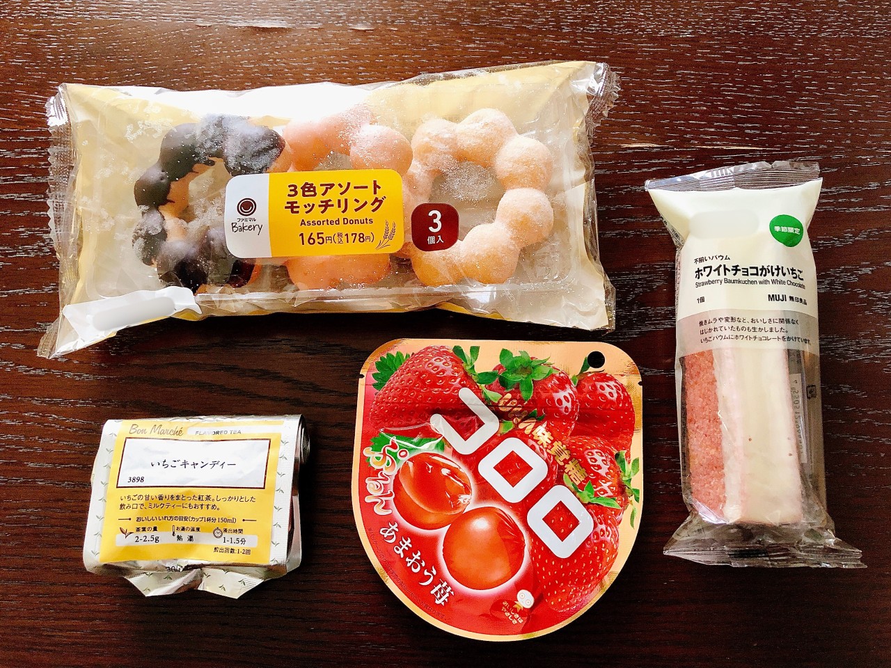 とりあえず目をつけたのがいちごのバウムクーヘンだったので、他も全部いちご味のものにしました🍓