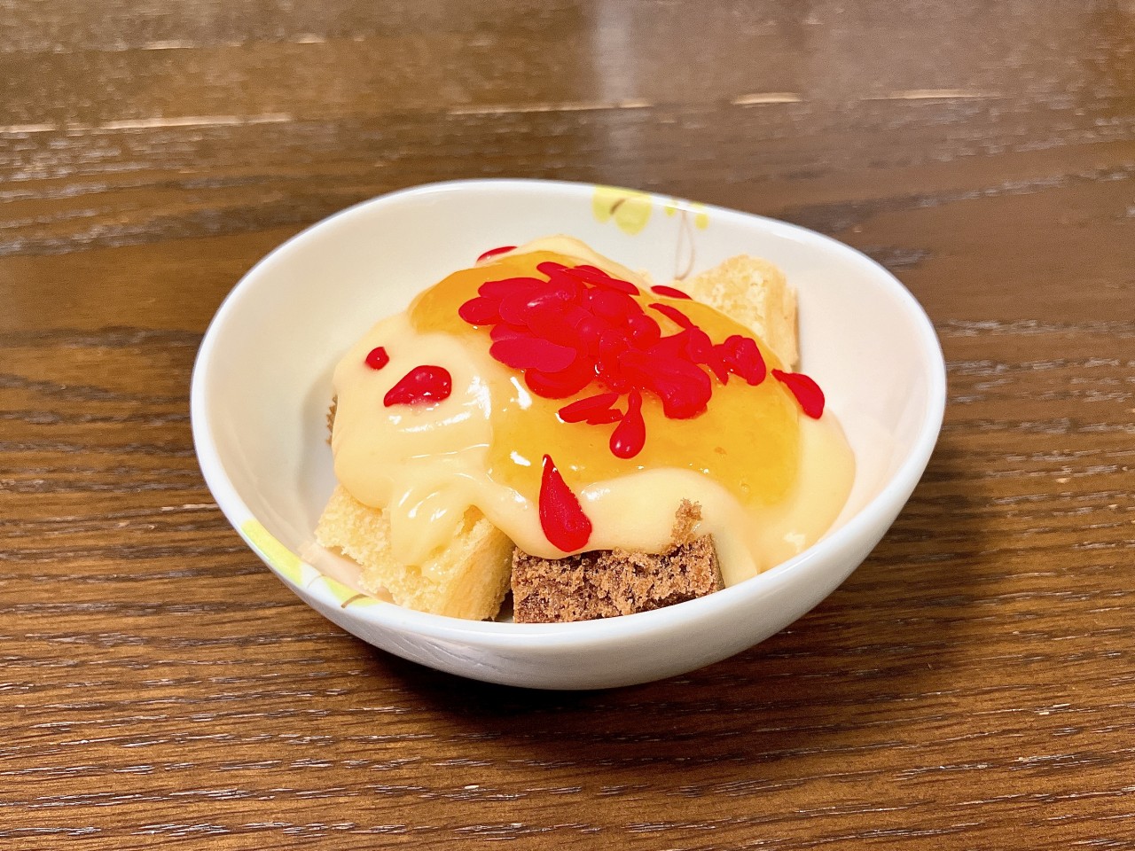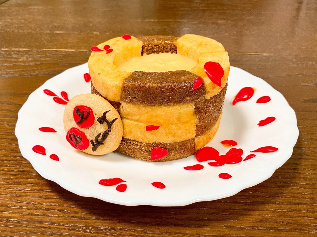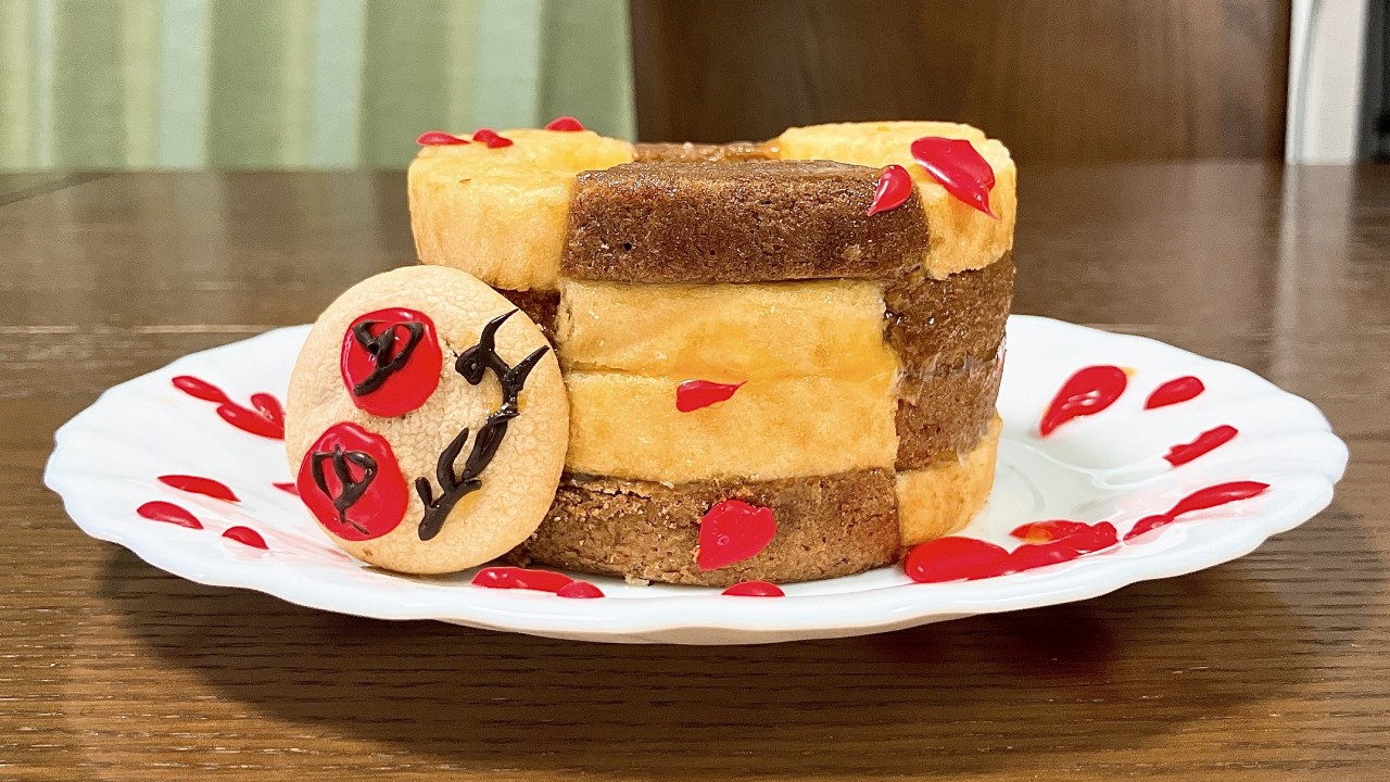 当時の公式のメニューは円いバウムクーヘンの穴にゼリーを詰めたワイルドさだったので、もうちょっと手を加えてみようと思います( ・̀∀・́ )