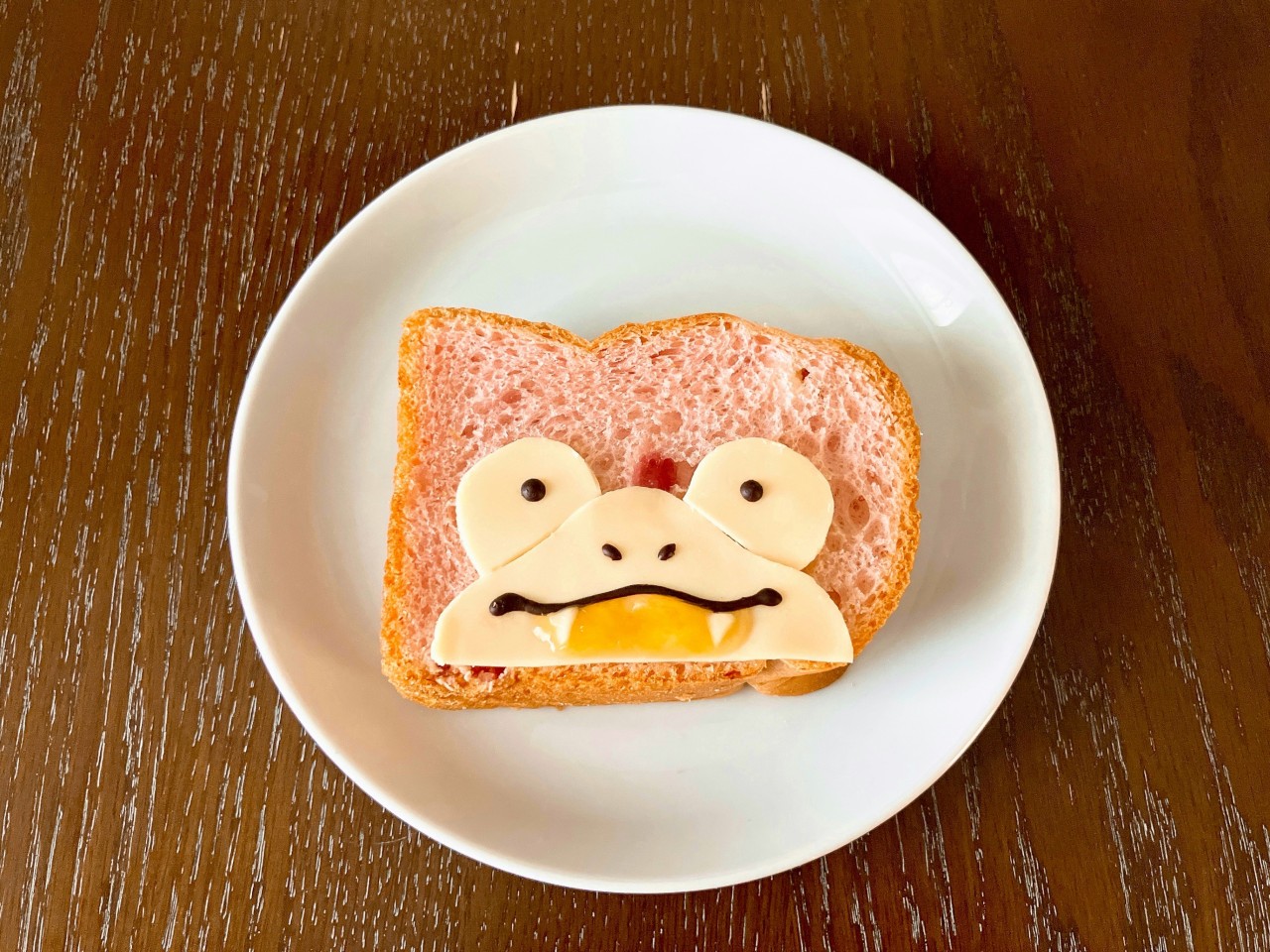 ハムとチーズ、黒ごまペースト、ケチャップで顔を作り、たまごサラダを挟んでいるので味は間違いないです🤤