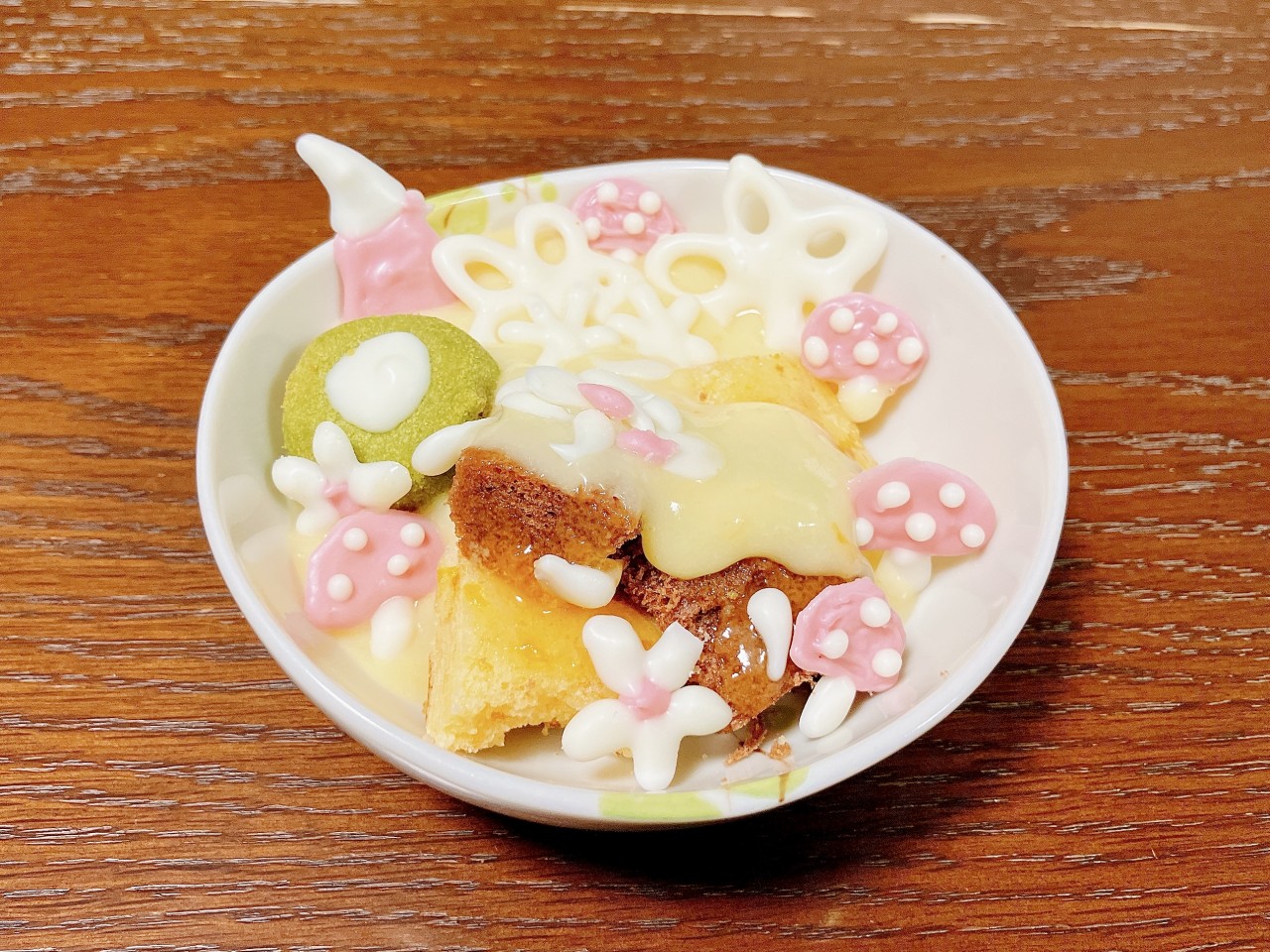 残った推しポケのシッポと、白丸をうまく描けなくて歪んでしまった抹茶の《チョコチップクッキー》ものっけて、今回のトライフルはちょっと豪華!