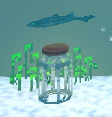 釣りでランタンをひろうったので、水槽に置こうと「デコレート」ボタンを押したら、あれ、デコレート部品リストの中に「雑草」がありました。流木や石と同じ部品でした。