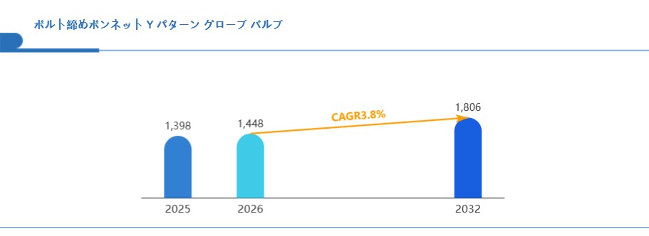 Global reports調査チームの最新レポート「グローバルボルト締めボンネット Y パターン グローブ バルブ市場規模、主要企業シェア、ランキング分析レポート【2026年版】」によると、グローバルボルト締めボンネット Y パターン グローブ バルブ市場は2025年の1398百万米ドルから2032年には1806百万米ドルに成長し、2026年の市場規模は約1448百万米ドルと推計されており、2026-2032年のCAGR(年間成長率)が3.8%に達すると予測されている。