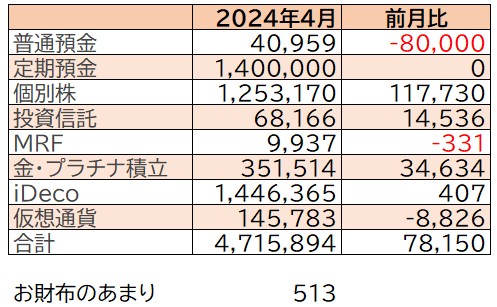 円安株安になってしまった4月度(2024/3/26~2024/4/24)の貯蓄記録です!