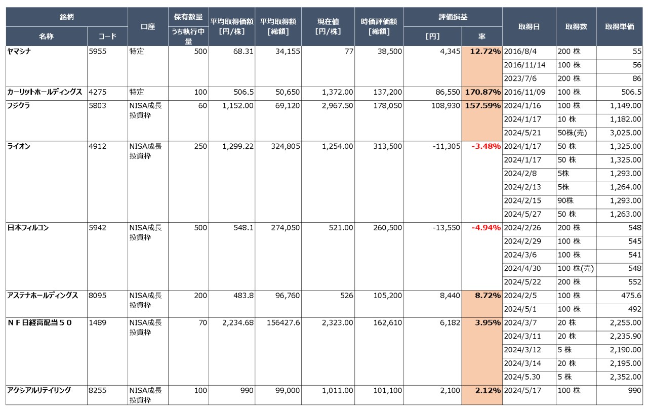いまいまの時点(8/1)で保有している銘柄情報がこちら。