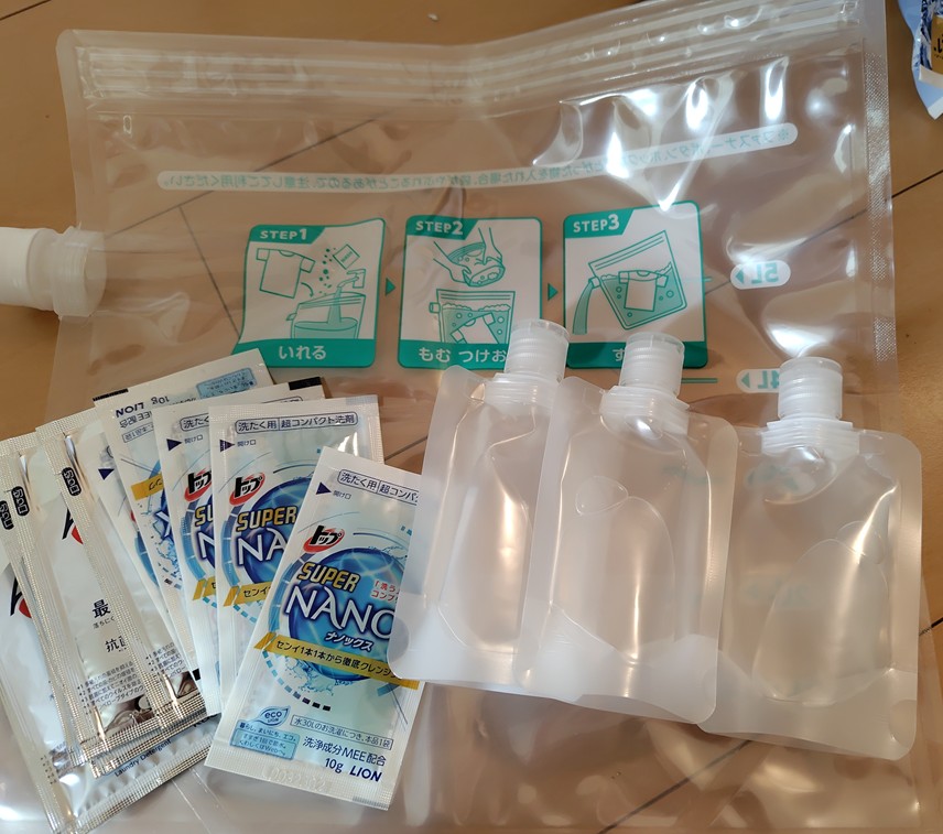 洗濯洗剤は小分けのパウチを、柔軟剤は上述の楽天で買ったパウチにいつも使っているものを詰めて持っていきました。