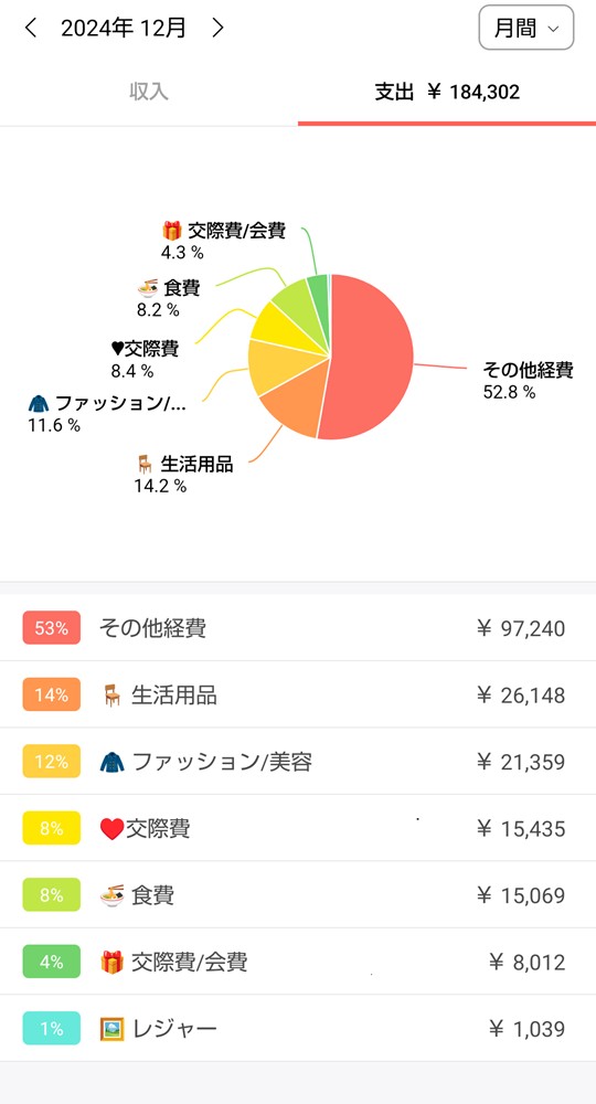 その他経費が住民税など残りの支払い分、生活用品で職場に持って行く貼るホッカイロを大量に買い込んだこと、あとは別の記事に書いていた、ボーナスを頂いたので冬物の服や防災用品を買ったり…で大幅にオーバーしてしまいました。