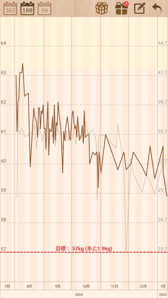 素足でしか反応しない体重計で測っており、最近本当に寒いので測定サボりがちではあるのですが、ピザやラーメンなどを食べたくなったらこのグラフを見て思いとどまるようにしています。