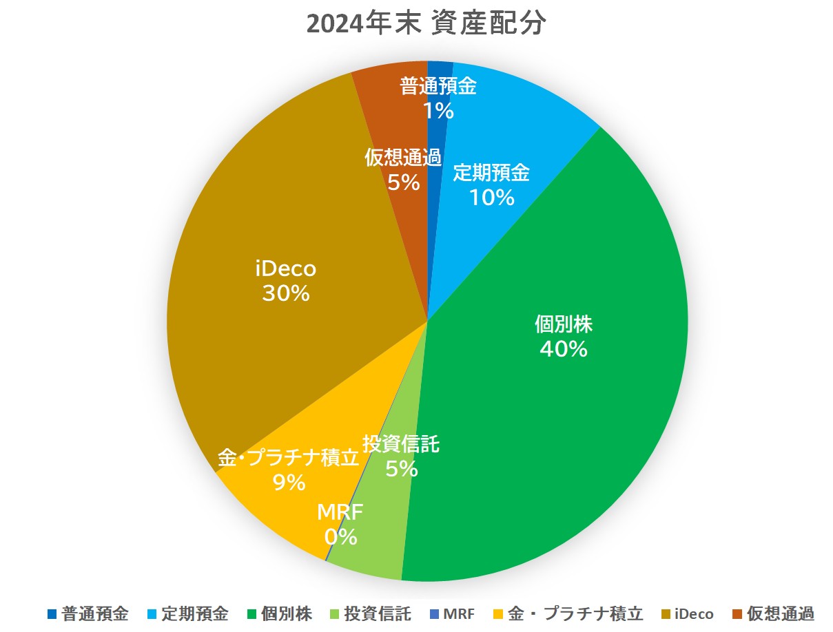 2024年末時点で、個別株が特定口座で1銘柄あり、それ以外の個別株、投資信託ともに新NISAで運用をしています。