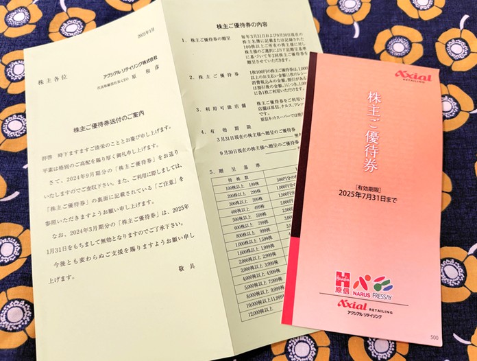 アクシアルさんは食料品を扱うスーパー(原信、ナルス、フレッセイ)を展開しており、毎年2回、そこで使える割引券などが優待品としてもらえます。