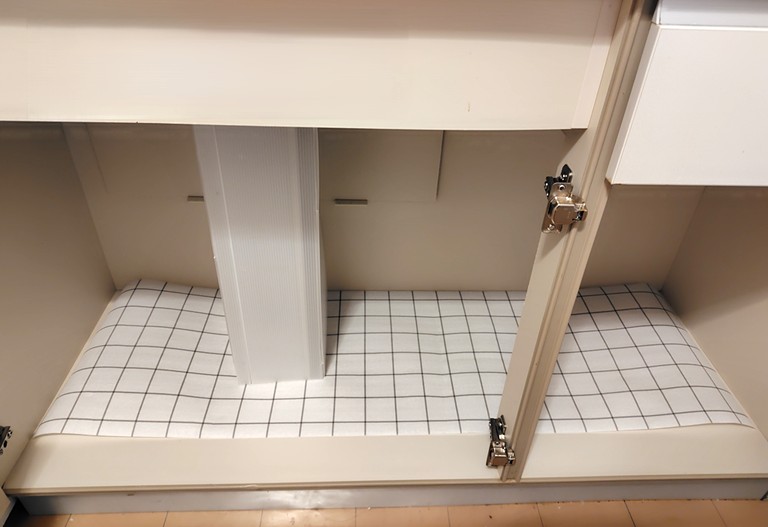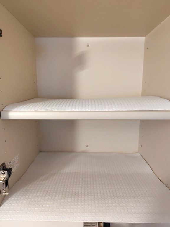 左にもこの2倍分の容量の同じような棚があるので、そちらにも同じようにシートを敷き、お皿をしまいました。