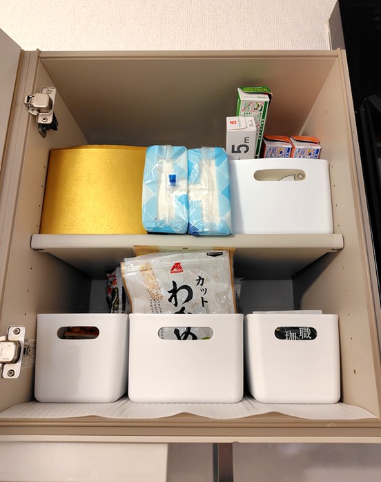 こんな感じで上段にキッチンまわりのストック品、下段にインスタント食品などをいれました。