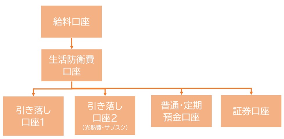 お給料をいれてもらう口座があるのですが、ここから生活費防衛口座に一部を移し、そこから引落用口座などに振り分けをしています。