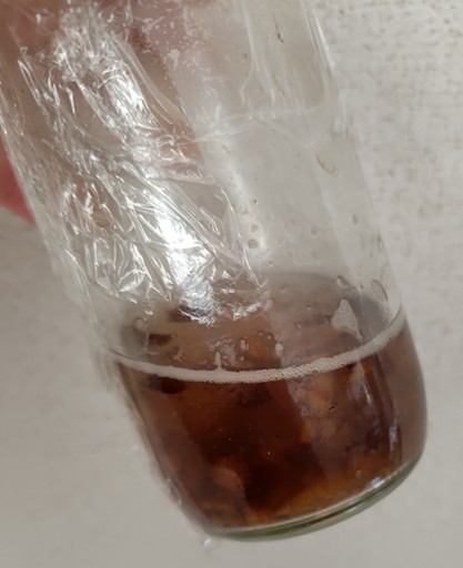 これも調べて、バナナの皮を刻んで水に3日ほど浸して液肥を作りました。写真のは5日ほど置いたもの。