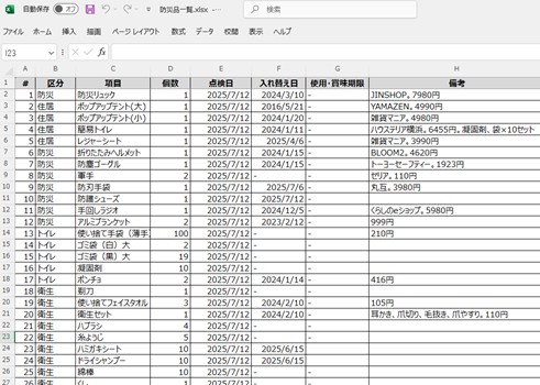 防災用品を半期に一度、棚卸ししていこうと思うので第一回目のメモです。