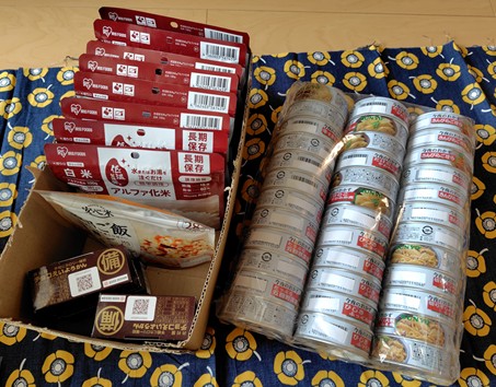 アルファ米、缶詰、えいようかん(チョコ)。あと別途2Lのペットボトルが10本ほどあります。