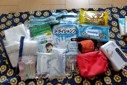 衛生用品いろいろ。ドライシャンプーと歯磨きシートはここに。