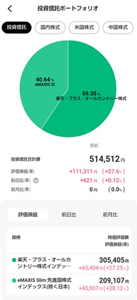 楽天・プラス・オールカントリー株式インデックス・ファンドを10,000円、eMAXIS Slim 先進国株式インデックス(除く日本)を5,000円毎月積み立てています。