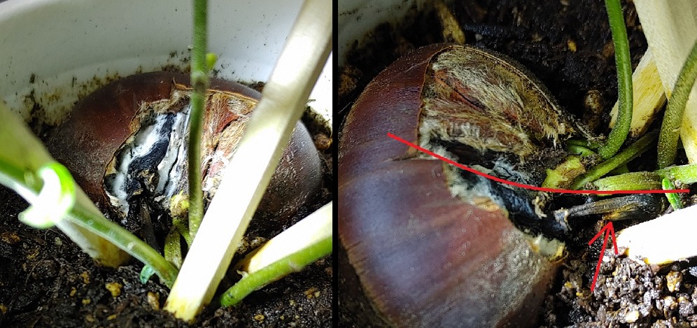 ちょっと前から殻の割れ目を照らすと何か白いものが見える……と思って嫌な予感がしつつ殻を割って見やすくしてみたらやっぱり!白カビと思われるものに覆われてた。そしてここから出てた根っこが黒く枯れた。