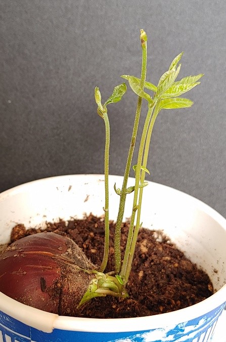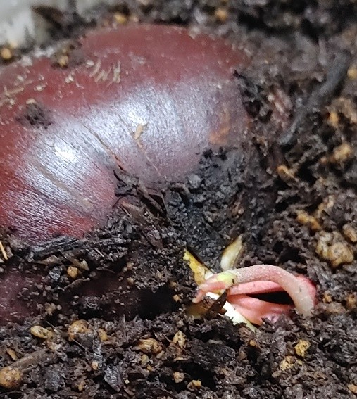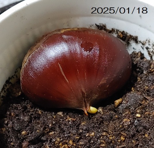 とりあえずよく見る発芽方法にて、栗を2024/10/15から冷蔵庫で保管。2025/01/08に発根(約86日目(2ヶ月と25日))を確認し、2025/01/18(約96日目(3ヶ月と4日))に土植え。