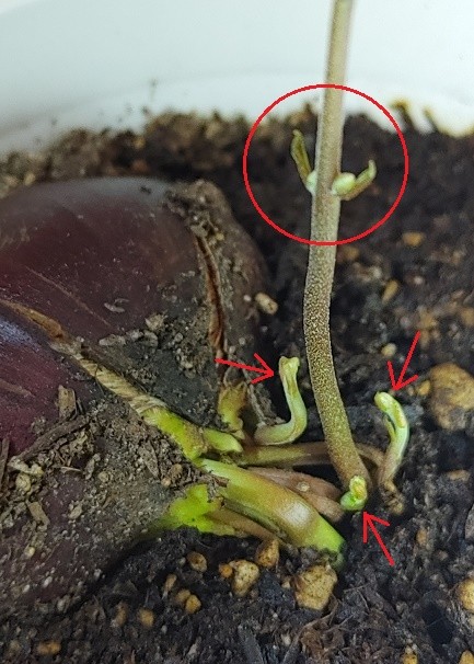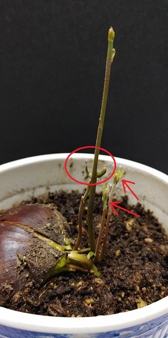 3本の新芽が出たよ。あと赤丸部分、葉?の付け根から何かしら出そう。