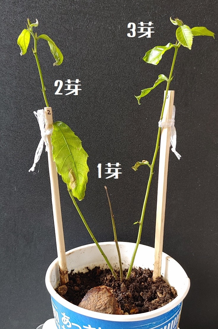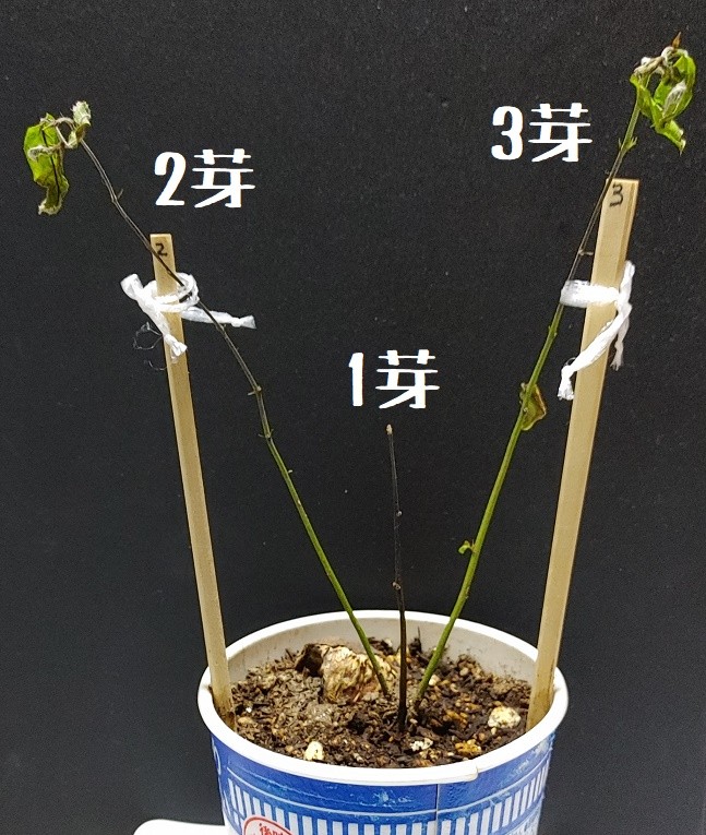 途中経過。1芽はほぼほぼ先端から枯れ出して、