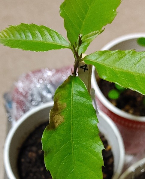 4芽、一番大きな葉が茶色く変色してきた。ヤバいか?