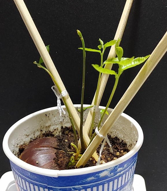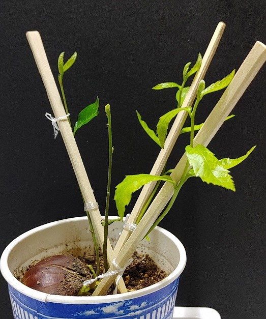 そしてそれぞれの芽の距離が近すぎるんで割り箸刺して誘引した。