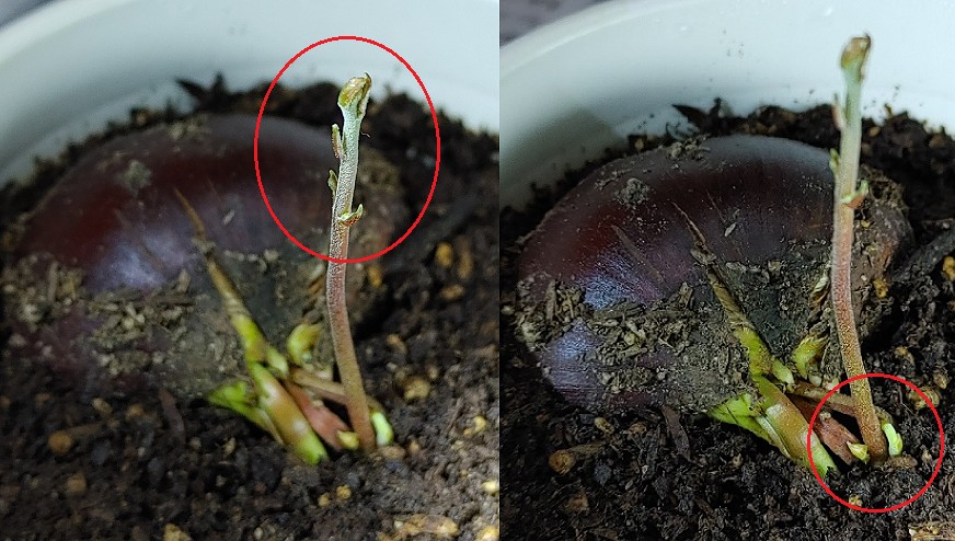 1本目の芽は葉っぱはまだだけどいろいろ成長してる。とくに背丈と赤丸部分。