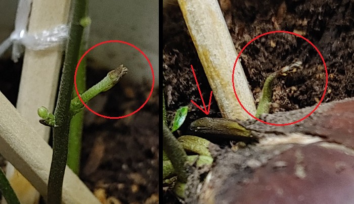 2芽は葉っぱの少し下あたりから茎が黒くなってきて倒れてきた。