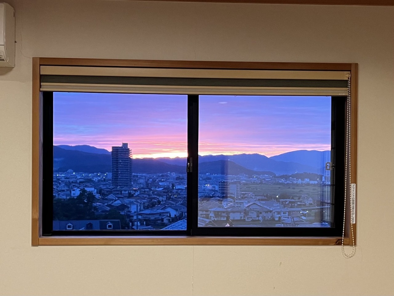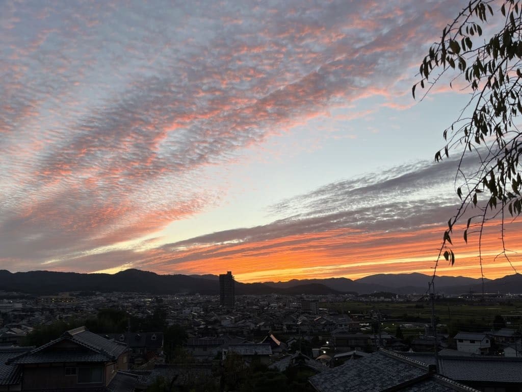 これは京都の禅寺で宿坊をしていたとき、坐禅の休憩時間に撮った夕焼け。