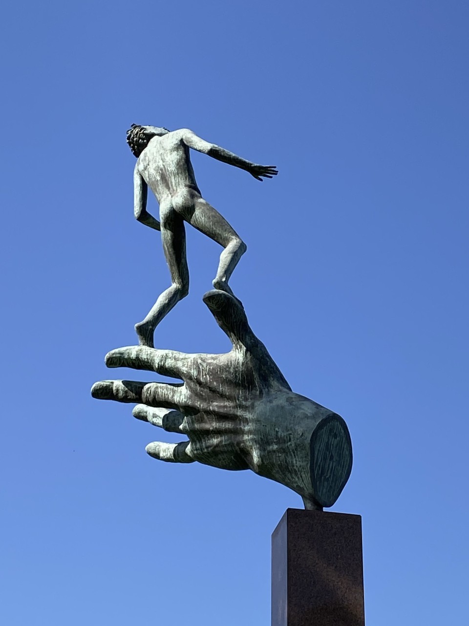 空と一体になった作品を見るとあっ!となって、長澤知之が彫刻家カール・ミレスの作品「神の手」が好きだということを思い出す。