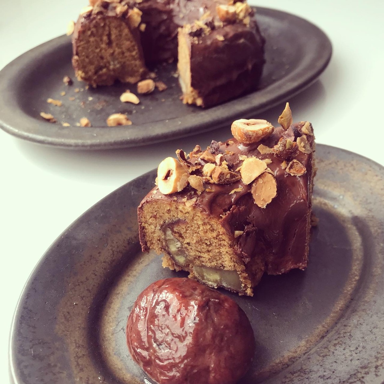 崩れた渋皮煮とコーヒーのケーキは昨夜焼いた。朝食のあとチョコレートをかけたまではいいが、上はどうすっかなと考え、ナッツが何種類かあったので飴がけにして砕いた。