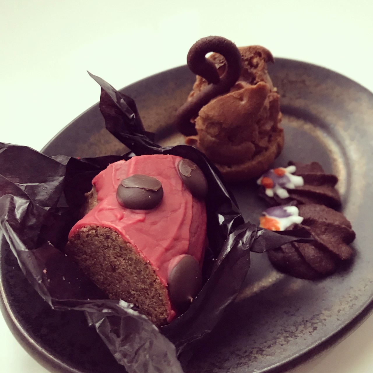 マーケットのテンプレートに添いたいわけではないので、ハロウィン?こういうのでもいいかい?と見立てて作ったのはみんなチョコレート、チョコレートクッキー、チョコレートケーキ、チョコレートシュー。