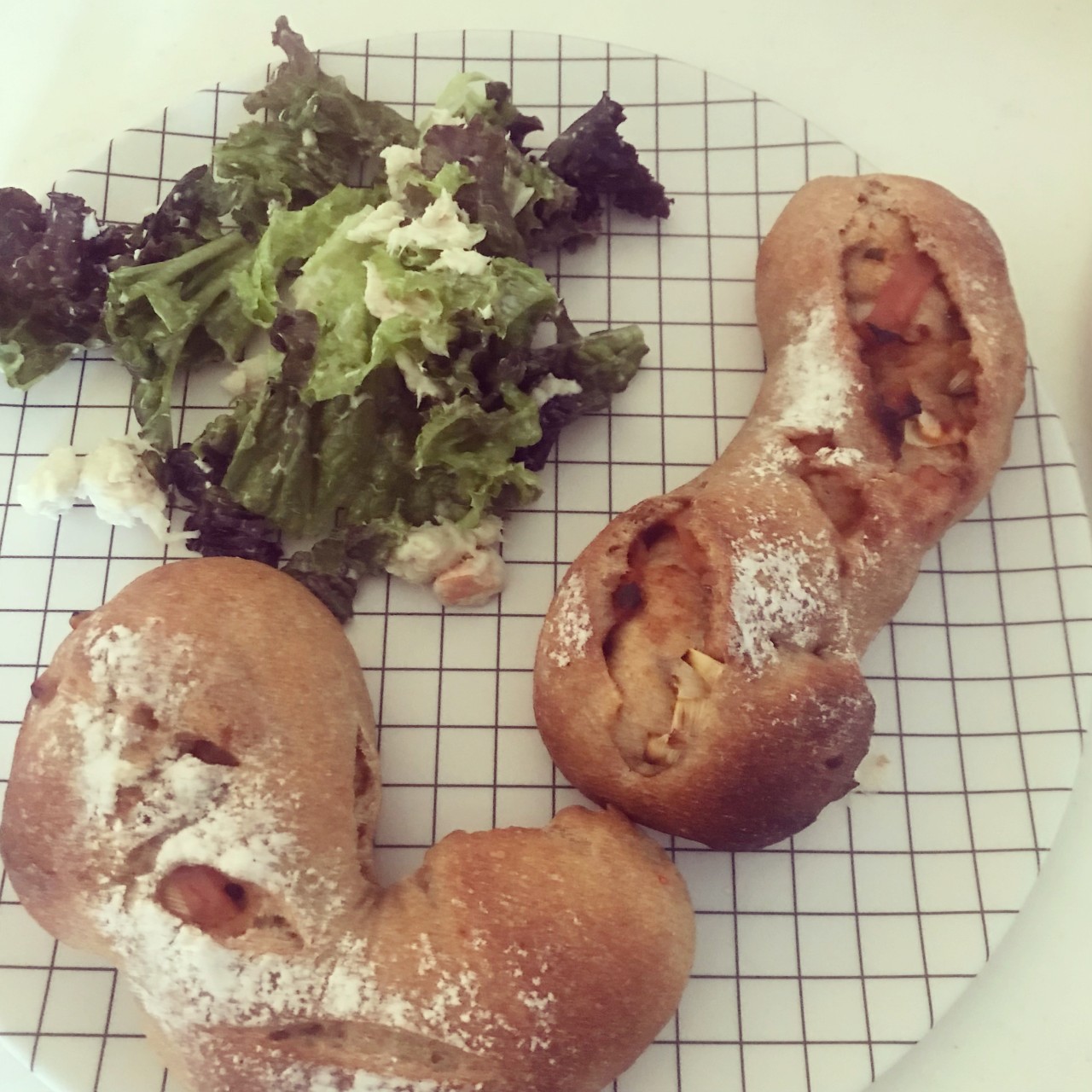 朝食に昨日焼いたパン。生地にはライ麦を混ぜた。瓶詰のねぎ味噌とベーコンと葱を巻いた。